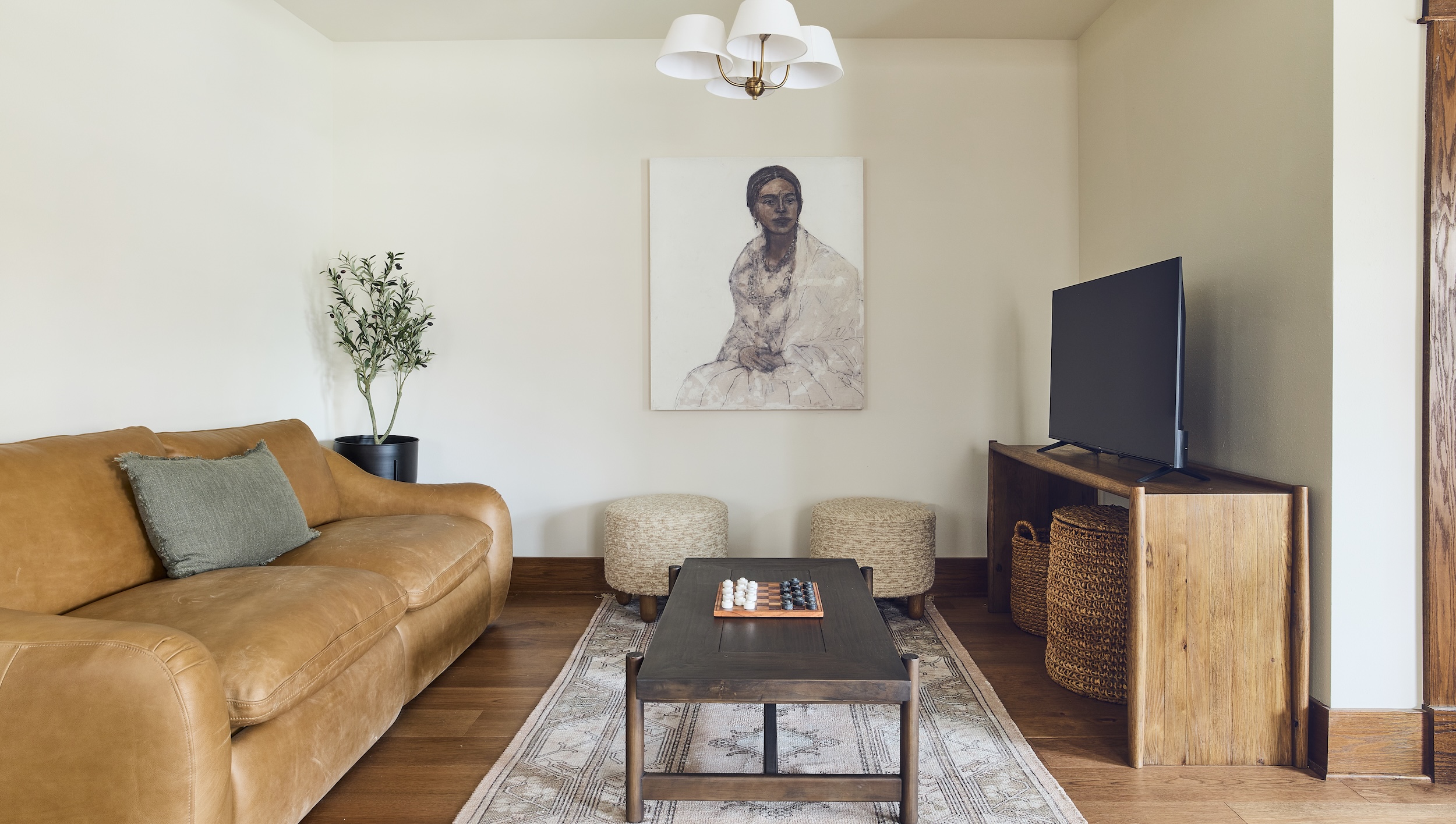 Perfect for families or groups, this premium two-bedroom apartment offers over 1,050 square feet of living space. It features two private bedrooms, a fully equipped kitchen, in-unit laundry, and a spacious living area designed for comfort and convenience. Each bedroom is furnished with a Tuft & Needle mattress and Bosker bedding, ensuring a restful stay.